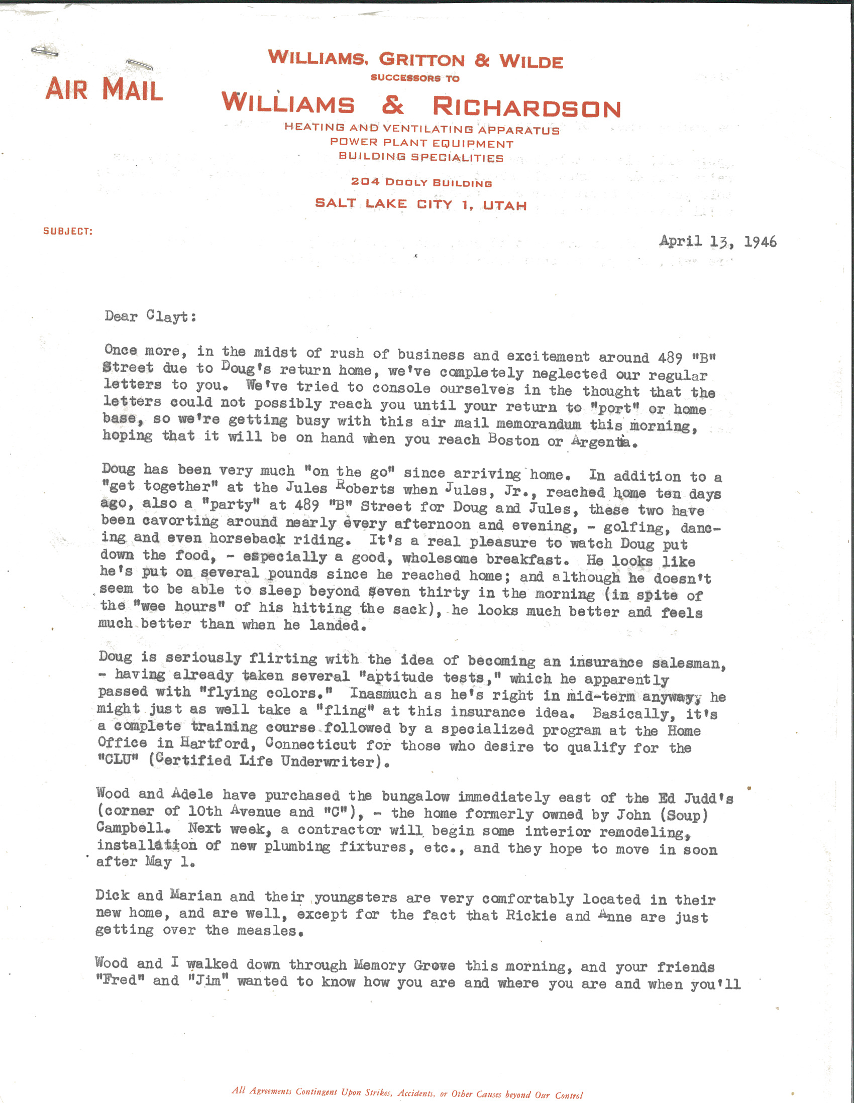 The company started out as Hawley, Richardson & Williams. After Mr. Hawley died it changed to be Williams and Richardson. Then, when Henry Richardson died and the partnership became Williams, Gritton & Wilde.  The five partners were Gilbert Williams, Dale Wilde, Earl Gritton, Richard C.Williams and Clayton R. Williams.